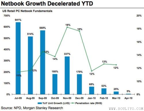 ຜົນການວິໄຈຕະຫລາດສະບັບນີ້ຍັງສະແດງ ໃຫ້ເຫັນຜົນກະທົບທີ່ມີຕໍ່ການເຕີບໂຕຂອງຍອດຂາຍເນັດບຸ໊ກທີ່ຕົກລົງໃນຊ່ວງເດືອນມັງກອນດ້ວຍ ໂດຍລຸດລົງຈາກ 179% ໃນເດືອນກ່ອນໜ້ານັ້ນລົງມາເຫລືອ 68% ຊຶ່ງຄາດວ່າ ໜ້າຈະເປັນຜົນມາຈາກການປະກາດເປີດຕົວຂອງໄອແພດ ຢ່າງໃດກໍຕາມ ການເຕີບໂຕຂອງເນັດບຸ໊ກໄດ້ຕົກລົງມາຢ່າງຕໍ່ເນື່ອງມາຕັ້ງແຕ່ເດືອນກໍລະກົດປີທີ່ແລ້ວທີ່ກະໂດດຂຶ້ນໄປສູງສຸດເຖິງ 641% ມັນເບິ່ງຄືຕະຫລາດເນັດບຸ໊ກໄດ້ເລີຍຈຸດອິ່ມຕົວໄປແລ້ວ ໃນລາຍງານຍັງເປີດເຜີຍອີກວ່າ ຍອດຂາຍເນັດບຸ໊ກ ລຸດລົງຍ່າງຕໍ່ເນື່ອງມາຕັ້ງແຕ່ຫລາຍເດືອນກ່ອນທີ່ເລີ່ມມີຂ່າວລື ກ່ຽວກັບໄອແພດອອກມາແລ້ວ ຢ່າງໃດກໍຕາມ ໃນເດືອນເມສາທີ່ໄອແພດເລີ່ມວາງຈຳໜ່າຍ ຍອດຂາຍເນັດບຸ໊ກກໍ່ຂະຫຍາຍໂຕເພງເເຕ່ 5% ເທົ່ານັ້ນ
