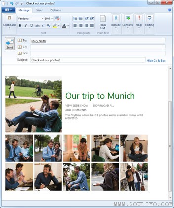 Windows Live Mail ການ​ກັບ​ຊາດ​ມາ​ເກີດ​ໃໝ່​ເທື່ອ​ທີ່​ເທົ່າໃດ​ບໍ່​ຮູ້​ຂອງ Outlook Express ຮອບ​ນີ້​ມີ Ribbon ເພີ່ມ​ເຂົ້າ​ມາ ແລະ​ສາມາດ​ແນບ​ໄຟລ໌​ຮູບ​ພາບ​ຂະໜາດ​ໃຫຍ່​ໄດ້ ໂດຍ​ເກັບ​ຮູບ​ໄວ້​ເທິງ Windows Live SkyDrive ໃຫ້​ອັດ​​ຕະໂນມັດ