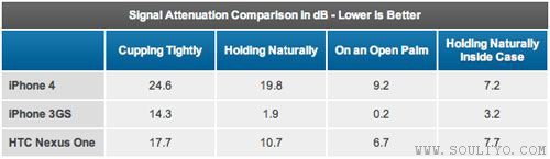 ຕາຕາລາງ ຜົນການທົດສອບ ການລຸດທອນຂອງລະດັບຄວາມແຮງຂອງສັນຍານ (dB) ເມືອຖື iPhone 4, iPhone 3GS ແລະ Nexus One ຕົວເລກຍິ່ງນ້ອຍຍິ່ງດີ ເບິ່ງຈາກຜົນການທົດສອບແລ້ວ iPhone 4 ສັນຍານຫົດຮຸນແຮງສຸດ ໃນຂະນະທີ່ 3GS ເບິ່ງໂອເຄຫລາຍໆ ແລະບໍ່ຄວນໃສ່ຊອງ ສ່ວນ Nexus One ເບິ່ງຈາກຄ່າການລຸດທອນຂອງສັນຍານເມື່ອຖືໂທໃນມື ກໍມີຄ່າລຸດທອນສັນຍານສູງພໍສົມຄວນ ແມ່ນໃນຍາມທີ່ຖືປົກກະຕິ (ບໍ່ໄດ້ບີບກະຊັບ)