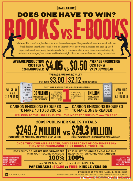 ໂດຍທາງເວັບໄຊຕ໌ Newsweek ໄດ້ຈັດເຮັດ Infographic ທີ່ເປັນການປຽບທຽບລະຫວ່າງ ຫນັງສື (ເກົ່າ) ກັບຫນັງສືໃໝ່ (Books Vs. E-Books) ໂດຍໃຫ້ຜູ້ອ່ານເປັນຜູ້ຕັດສິນເອງວ່າໃຜຈະເປັນຜູ້ຊະນະໃນສຶກນີ້? ຢ່າງໃດກໍຕາມ ຖ້ອຍຖະແຫລງທີ່ຊັດເຈນກຽວກັບຈຸດແຂງຂອງຫນັງສືກໍຄື “ຄຸນນະພາບຂອງຫນັງສື (ພາຍໃຕ້ແສງທຳມະຊາດ) ຍັງຄົງສາມາດເບິ່ງເຫັນໄດ້ງ່າຍທີ່ສຸດດ້ວຍຕາຂອງຜູ້ອ່ານ” ແຕ່ທີ່ໜ້າຢ້ານກໍຄື ຍອດຂາຍທີ່ປຽບທຽບລະຫວ່າງ 249.2 ລ້ານຫລຽນຯ ຂອງຫນັງສືເຫຼັ້ມກັບ 29.3 ລ້ານຫລຽນຂອງ e-books ທີ່ໃຫ້ລາຍລະອຽດເພິ່ມເຕິມວ່າ ເຈົ້າຂອງ Kindle ຊື້ອີບຸ໊ກຫລາຍຂຶ້ນກວ່າການຊື້ຫນັງສືເຫຼັ້ມປົກກະຕິ 3.3 ເທົ່າ ເຫດຜົນງ່າຍໆ ກໍຄື ລາຄາທີ່ຖືກກວ່າເກືອບ 1 ໃນ 3 ຂອງລາຄາເຫຼັ້ມນັ້ນເອງ ສຳລັບຂໍ້ມູນປຽບທຽບໃຫ້ເຫັນການແຂ່ງຂັນຂອງຫນັງສືທັງສອງຊະນິດທີ່ທາງນິວສ໌ ວີກນຳມາເຜີຍແຜ່ເປັນດັ່ງຮູບຂ້າງລຸມນີ້