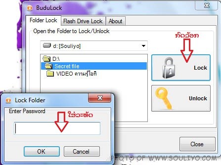 - ແລະຖ້າຢາກປົດລັອກເພື່ອເຂົ້າໄປກໍເປີດໂປແກມ BuduLock ອີກເທື່ອ ແລ້ວກັບໄປເລືອກ Folder ເກົ່າ(ເຮັດແບບເກົ່າ) ແລ້ວກົດປຸ່ມ Unlock ແລ້ວກໍໃສ່ ລະຫັດຜ່ານເຂົ້າໄປ ພຽງເທົ່ານີ້ຈົບ.