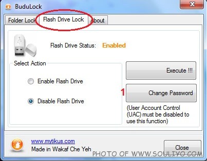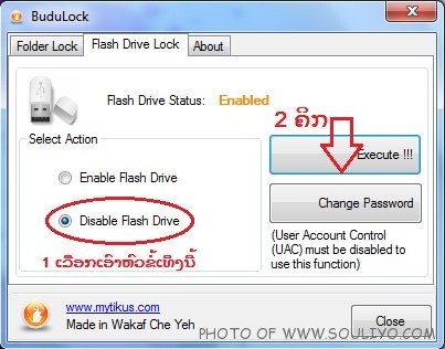ຊຶ່ງຖ້າຢາກເປີດໃຊ້ງານອີກເທື່ອກໍເລືອກທີ່ Enable Flash Drive ແລ້ວກໍກົດ Execute ຕາມດ້ວຍການໃສ່ລະຫັດຜ່ານ ເທົ່ານີ້ກໍ່ຈົບ ແລະບົດຄວາມກໍ່ຈົບ