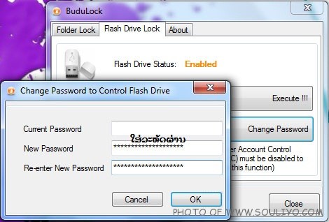 ວິທີການປ້ອງກັນກໍງ່າຍແສນງ່າຍ ເປີດໂປແກມ BuduLock ແລ້ວໄປທີ່ແທັບ Flash Drive Lock ກົດປຸ່ມ Change Password ເພື່ອຕັ້ງລະຫັດຜ່ານກັນກ່ອນ ຈາກນັ້ນເລືອກ Disable Flash Drive ແລ້ວກົດປຸ່ມ Execute ເພື່ອກໍ່ການລັອກບໍ່ໃຫ້ໃຊ້ງານ USB Drive