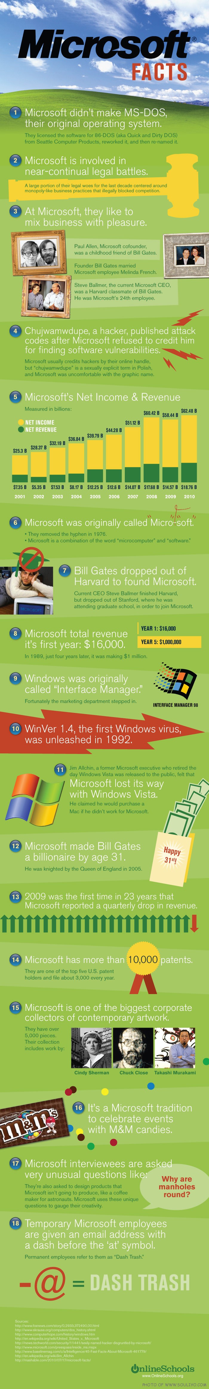 ນອກຈາກເລື່ອງ MS-DOS ບໍ່ໄດ້ເປັນຂອງໄມໂຄຊອຟົທ໌ມາຕັ້ງແຕ່ທຳອິດແລ້ວ ເມື່ອເວົ້າເຖິງໄມໂຄຊອຟົທ໌ໃນໂລກອອນໄລນ໌ ຄົນສ່ວນໃຫຍ່ກໍຈະຄຸ້ນເຄີຍແລະນຶກເຖິງ Hotmail ຫລື Bing ແຕ່ຄວາມຈິງນັ້ນ ໄມໂຄຊອຟົທ໌ໄດ້ຖືສິດທິບັດໄວ້ຫລາຍກວ່າ 10,000 ສິດທິບັດ (ແຖມຈົດເພີ່ມທຸກໆປີ ປີລະ 3,000 ສິດທິບັດ) ຫລືເຊັ່ນເລື່ອງນ້ອຍໆ ຢ່າງເຊັ່ນຊື່ບໍລິສັດທີ່ຈາກເດີມຂຽນວ່າ Micro-Soft ມີຂີດຕໍ່ລະຫວ່າງກາງກໍຖືກເອົາອອກໄປຕັ້ງແຕ່ປີ 1976. ແລະຍັງມີຂໍ້ເທັດຈິງກ່ຽວກັບ Microsoft ອີກຫລວງຫລາຍ ລອງເບິ່ງຈາກ Infograph ຂອງ Online MBA Program ລອງເບິງເນາະ