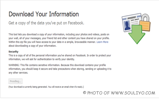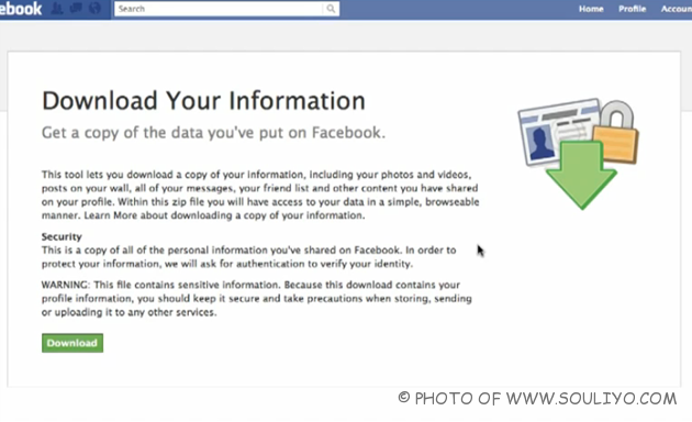 ລາງານຂ່າວລ່າສຸດ Facebook ອັບເດດຟີເຈີລ໌ໃໝ່ ໂດຍຟີເຈີລ໌ໃໝ່ຕົວນີ້ມີຊື່ວ່າ Download Your Information ເປັນຟີເຈີລ໌ທີ່ຢູ່ໃນການພັດທະນາຂອງໂຄງການ Diaspora Project ຊຶ່ງສ້າງໃຫ້ມີຄຸນສົມບັດສ້າງຄວາມປອດໄພໃຫ້ກັບຂໍ້ມູນຂອງເຮົາຫລາຍຍິ່ງຂຶ້ນ ໂດຍເປັນຟີເຈີລ໌ນີ້ຈະເຫັນກໍ່ຕໍ່ເມື່ອເຂົ້າໄປໃນ Account Settings ແລ້ວຈະມີຫົວຂໍ້ Download Your Information ເມຶ່ອເຂົ້າໄປຈະມີຫນ້າດາວນ໌ໂຫລດຂຶ້ນມາ ໂດຍຈະເຮັດໃຫ້ເຮົາສາມາດດາວນ໌ໂຫລດຂໍ້ມູນທຸກຢ່າງຂອງເຮົາຈາກ Facebook ນັ້ນອອກມາໄດ້ທັງໝົດ ບໍ່ວ່າຈະເປັນຂໍ້ມູນໂປໄຟລ໌ຕົວເອງ ລາຍຊື່ຫມູ່, ກິດຈະກຳຕ່າງໆ ຂໍ້ຄວາມເທິງກະດານລວມທັງຮູບພາບທັງຫມົດ ຊຶ່ງໄຟລ໌ທີ່ດາວນ໌ໂຫລດອອກມານັ້ນຈະເປັນສະກຸນ.zip ທີ່ມີທາງໃນເປັນໄຟລ໌ HTML ແລະໄຟລ໌ຮູບຕ່າງໆ. ຊຶ່ງການດາວນ໌ໂຫລດນີ້ບໍ່ໄດ້ເປັນການລົບໄຟລ໌ຂໍ້ມູນຕ່າງໆ ອອກຈາກ Facebook ຂອງເຮົາ ແຕ່ຢ່າງໃດ ເປັນພຽງແຕ່ການດາວນ໌ໂຫລດຂໍ້ມູນຂອງເຮົາມາເກັບໄວ້້ເທົ່ານັ້ນ. ຫລັງຈາກດາວນ໌ໂຫລດແລ້ວກໍ່ລໍຖ້າຈົນກວ່າຈະໄດ້ຮັບເມວຈາກທາງ Facebook.