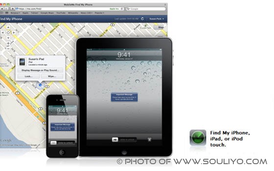 ເທົ່ານັ້ນຍັງບໍ່ຫມົດ Apple ຍັງແຈກ Find my iPhone ສຳຫລັບ iPad, iPhone ແລະ iPod Touch ອີກດ້ວຍເຊິງຄວາມສາມາດໂຕນິ ຮູ້ສຶກວ່າມັກຫລາຍ ເວລາທີ່ເຄື່ອງເຮົາເສຍ ຫລືຖືກລັກ, ອາດຈະຕົກຕາມຊອກລືບໃດຫນຶງໃນຫ້ອງນອນ ເຮົາກໍ່ສາມາດສັ່ງໃຫ້ມັນດັງ,ລະບູຕຳແຫນ່ງ GPS (ອັນນິລອງແລ້ວ ຂະຫນາດໃຊ້ກັບ WIFI ມັນຍັງແນ່ໃສ່ຫລັງຄາເຮືອນແບບບໍ່ຜິດດ່ຽວເລີຍ), ສັ່ງລັອກເຄື່ອງດ້ວຍລະຫັດ PIN ສີຕົວເລກ ແລະທີ່ສຳຄັນສາມາດສັ່ງລຶບຂໍ້ມູນຕ່າງໆໃນ iPad, iPhone ແລະ iPod Touch ທາງໄກໄດ້ອີກດ້ວຍ ເມຶ່ອຫາບໍ່ເຫັນແທ້ໆ.