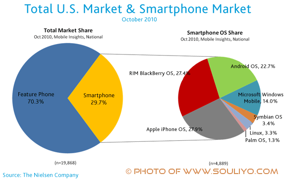 ຈາກສ່ວນແບ່ງຂອງຕະຫລາດສະມາດໂຟນນັ້ນ ສ່ວນແບ່ງຫລາຍອັນດັບຫນຶ່ງຍັງເປັນ iOS ຂອງ Apple ທີ່ກິນສ່ວນແບ່ງຕະຫລາດໄປ 27.9% ແລະ ອັນດັບສອງເປັນ BlackBerry ຂອງ RIM ເຊິງກິນສ່ວນແບ່ງຕະຫລາດໄປສູສີກັບ iOS ຫລືາຍເຊິ່ງຢູ່ທີ່ 27.4%, ຕາມາດ້ວຍອັນດັບສາມແມ່ນ Android ທີ່ນຳມາຕິດ ແລະຕອນນີ້ມີສ່ວນແບ່ງໃນຕະຫລາດໄປແລ້ວເຖິງ 22.7%, ອັນດັບສີ່ເປັນຂອງ Windows Phone ກິນສ່ວນແບ່ງຕະຫລາດໄປ 14%, ອັນດັບຫ້າເປັນຂອງ Symbian ກິນສ່ວນແບ່ງຕະຫລາດຢູ່ທີ່ 3.4%, ຂອງ Linux 3.3% ແລະ Palm ຢູ່ທີ່ 1.3%.