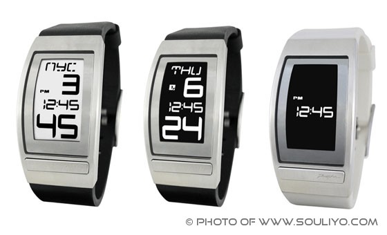 ອັນຕໍ່ມາຊື່ວ່າ World Time Curved E Ink Watch ເປັນໂມງຈາກທາງ www.phosphorwatches.com ເຊິງຈະໃຊ້ເທັກໂນໂລຢີ E Ink ເປັນເທັກໂນໂລຢີ ທີ່ໃຊ້ໃນເຄື່ອງອ່ານອີບຸ໊ກ ຢ່າງ Kindle ເພຶ່ອບໍ່ໃຫ້ສະທ້ອນ ຫລື ເຫລື້ອມ ໃນທີ່ແຈ້ງນັ້ນເອງ. ສຳລັບ World Time Curved E Ink Watch ນີ້ຈະມີໃຫ້ເລືອສອງສີ ຄື: ສີຂາວ ແລະ ດຳ ສຳລັບສີດຳຈະມີສອງແບບໃຫ້ເລືອກຄື ແບບສາຍເປັນຫນັງ ແລະ ເປັນຢາງ, ນອກນັ້ນຍັງມີລຸ້ນທີ່ເປັນສະເຕັນເລດອີກດ້ວຍ. ສຳລັບລາຄາແມ່ນເລີ່ມຕົ້ນທີ່ $150ລຸ້ນສາຍເປັນຢາງ, $165ລຸ້ນສາຍເປັນຫນັງ ແລະ ແບບສະເຕັນເລດແມ່ນຢູ່ທີ່ $195 ເຊິ່ງທຸກລຸ້ນຈະມີຫນ້າຈໍສະແດງຜົນແບບດຽວກັນ ເຊິງສາມາດປ່ຽໄດ້ຫລາຍແບບອີກດ້ວຍ. ລາຍລະອຽດ www.phosphorwatches.com