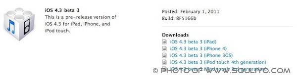 ລ່າສຸດ Apple ໄດ້ປ່ອຍສຸດ iOS 4.3 beta 3 (build 8F5166b) ສຳລັບ iPhone, iPad, ແລະ iPod touch ໃຫ້ກັບນັກພັດທະນາ ເຊິ່ງລາຍລະອຽດຍັງບໍ່ມີຫຍັງຫລາຍ ແຕ່ມີຫລາຍສຳນັກຂ່າວຄາດການວ່າເວີຊັ່ນເຕັມກຳລັງຈະມາ ອາດຈະຖ້າອອກພ້ອມກັບ iPad 2 ແລະ iPhone 5.