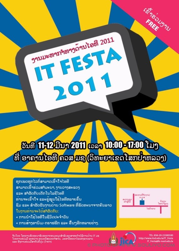 ລາສຸດໂຄງການ ພັດທະນາຊັບພະຍາກອນມະນຸດ ເພື່ອອຸດສາຫະກໍາການບໍລິການໄອທີ ຢູ່ທີ່ມະຫາວິທະຍາໄລແຫ່ງຊາດລາວ (ໂຄງການ ITSD) ພາຍໃຕ້ການຊ່ວຍເຫລືອ ຈາກອົງການຮ່ວມມືສາກົນຢີ່ປຸ່ນ (JICA), ກຳລັງຈະມີການຈັດງານມະຫາກໍາທາງດ້ານໄອທີຂຶ້ນ ທີ່ພາກວິຊາວິສະວະກຳຄອມ ພິວເຕີ ແລະ ເທັກໂນໂລຊີຂໍ້ມູນຂ່າວສານ, ຄະນະວິສະວະກຳສາດ (ວິທະຍາເຂດໂສກປ່າຫລວງ) ມະຫາວິທະຍາໄລແຫ່ງຊາດລາວ ໃນວັນທີ 11-12 ເດືອນມີນາ ປີ 2011.