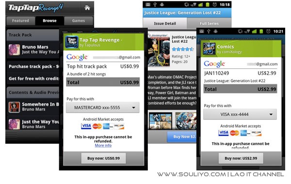 ລ່າສຸດ Google ໄດ້ປະກາດເປີດໃຊ້ In-app Billing ໃຫ້ກັບນັກພັດທະນາ ແລະ ຜູ້ໃຊ້ອຸປະກອນ Android ແລ້ວ. ໂດຍໃນການເລີ່ມເປີດໃຊ້ນີ້ກໍ່ມີ App ຫລາຍໂຕທີ່ພ້ອມໃຫ້ບໍລິການແລ້ວ ເຊັ່ນ: Tap Tap Revenge ໂດຍ Disney Mobile; Comics ໂດຍ ComiXology; Gun Bros, Deer Hunter Challenge HD, ແລະ WSOP3 ໂດຍ Glu Mobile; ແລະ Dungeon Defenders: FW Deluxe ໂດຍ Trendy Entertainment.