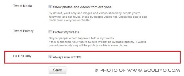 ລ່າສຸດ Twitter ໄດ້ເປີດໃຫ້ຜູ້ໃຊ້ຕັ້ງຄ່າການໃຊ້ງານ ໂດຍສາມາດເລືອກໃຊ້ Https ແບບຕະຫລອດເວລາໄດ້. ເພຶ່ອເພີ່ມຄວາມປອດໄພຂອງຜູ້ໃຊ້ໃຫ້ມີລະດັບທີ່ປອດໄພສູງຂຶ້ນ. ຢ່າງໃດກໍ່ຕາມ, ປົກກະຕິທາງ Twitter ກໍ່ຈະກະເຂົ້າລະຫັດ https ທຸກຄັ້ງຢູ່ແລ້ວ ໃນເວລາລັອກອິນ. ແຕ່ການເຮັດຕົວເລືອກນີ້ຂຶ້ນມາ ແມ່ນໃຫ້ເຂົ້າລະຫັດແບບ https ຕະຫລອດເວລາ ຫລື ທຸກຫນ້ານັ້ນເອງ.
