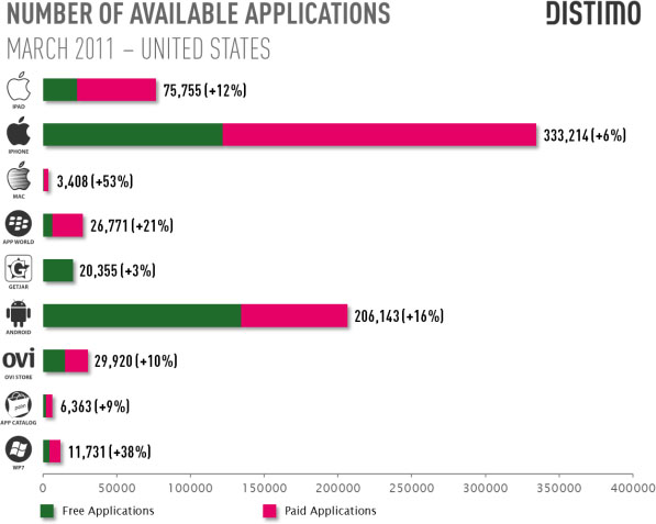 ໂດຍໂຕເລກຂອງ Free App ໃນ Android Market ປະຈຸບັນມີ 134,342 App ສ່ວນ Free App ໃນ App Store (ສະເພາະ iPhone ບໍ່ລວມຂອງ iPad) ນັ້ນມີພຽງ 121,845 App ເທົ່ານັ້ນ. ຖືວ່າເປັນໂຕເລກທີ່ສູສີກັນຫລາຍ. ຢ່າງໃດກໍ່ຕາມ ຍອດ Paid App ໃນ Android Market ນັ້ນມີພຽງ 1ສ່ວນ 3 ຂອງ Paid App ສຳລັບ iOS ເທົ່ານັ້ນ.