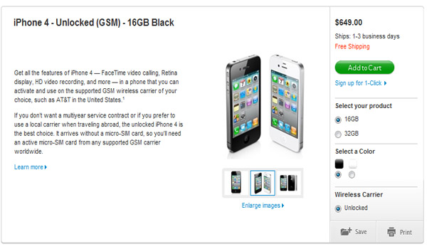 ລ່າສຸດ Apple ໄດ້ເລີ່ມຂາຍ iPhone 4 ລຸ້ນປົດລັອກຢ່າງເປັນທາງການ ໃນອາເມລິກາແລ້ວ ເຊິ່ງຈະລວມທັງສີຂາວ ແລະ ສີດຳ ໂດຍມີລາຄາ $649 ສຳລັບ 16GB ແລະ $749 ສຳລັບ 32GB. ເຊິ່ງ iPhone 4 ລຸ້ນປົດລັອກທີ່ Apple ເລີ່ມວາງຂາຍນີ້ ແມ່ນຈະສາມາດໃຊ້ກັບລະບົບ GSM ໄດ້ທົ່ວໂລກ ພຽງແຕ່ນຳຊິມກາດຂອງເບີ GSM ມາໃສ່ ແລ້ວກໍ່ນຳເຂົ້າໄປ Activate ໃນ iTunes ເທົ່ານີ້ກໍ່ສາມາດໃຊ້ງານໄດ້ແລ້ວ. ເຊິ່ງຄາດວ່າໃນອານາຄົດເມຶ່ອອັບເດດເປັນ iOS 5 ແລ້ວ ກໍ່ຄົງຈະບໍ່ຕ້ອງເຊື່ອມຕໍ່ກັບ iTunes ເພຶ່ອ Activate ອີກຕໍ່ໄປ.
