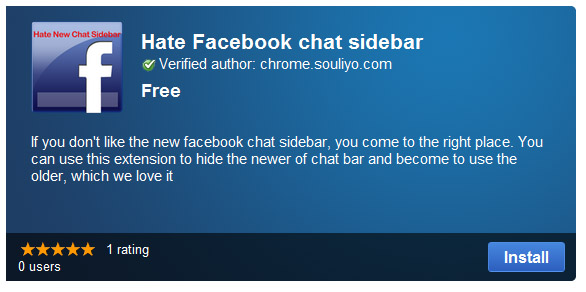 ວິທີການກໍ່ງ່າຍໆ ພຽງແຕ່ໃຫ້ທ່ານເຂົ້າໄປດາວໂຫລດສ່ວນເສີມທີ່ຊື່ວ່າ Hate Facebook Chat Sidebar ຈາກ Chrome Web Store ໂດຍເຂົ້າໄປທີ່ລິ້ງທາງດ້ານລຸ່ມສຸດຂອງບົດຄວາມ ແລ້ວກໍ່ຄິກ Install ເທົ່ານີ້ທ່ານກໍ່ຈະສາມາດກັບມາໃຊ້ Facebook Chat ຫນ້າຕາເກົ່າທີ່ມັກ ແລະ ຄຸ້ນເຄີຍກັນໄດ້ແລ້ວ.