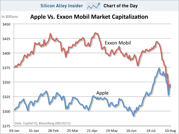 ລາຍງານຫລ້າສຸດໃນວັນທີ 10ສິງຫາ ທີ່ຜ່ານມາຕາມເວລາຂອງອາເມລິກາ, ບໍລິສັດ Apple ໄດ້ຂຶ້ນເປັນບໍລິສັດທີ່ມີມູນຄ່າສູງທີ່ສຸດໃນໂລກ ຫລັງຈາກທີ່ຕະຫລາດຫຸ້ນປິດລົງ ທີ່ລາຄາ $363.69 ຕໍ່ຫຸ້ນ, ເຊິ່ງເປັນຍອດທີ່ຕົກລົງມາ 2.8% ແລະ ມີມູນຄ່າທັງຫມົດ $337ພັນລ້ານ. ເຊິ່ງໃນຂະນະດຽວກັນ, ບໍລິສັດທີ່ມີມູນຄ່າສູງທີ່ສຸດໃນໂລກມາແຕ່ປີ 2005 ຢ່າງ Exxon Mobil ກໍ່ມີລາຄາຫຸ້ນທີ່ຕົກລົງມາແບບຫນ້າຕົກໃຈ ເຊິ່ງຕົກລົງມາ 4.4% ຈຶ່ງເຮັດໃຫ້ມີ ລາຄາເຫລຶ່ອພຽງ $68.03 ຕໍ່ຫຸ້ນ ແລະມູນຄ່າລວມຂອງບໍລິສັດຢູ່ທີ່ $331ພັນລ້ານ.