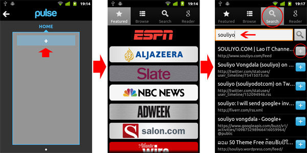 ຫລັງຈາກລຶບອອກຫມົດແລ້ວ ເຮົາກໍ່ມາຈັດການເພີ່ມສຳນັກຂ່າວ SOULIYO.COM ເຂົ້າໄປໃນ Pulse ກັນເລີຍ, ໂດຍແທັບໄປທີ່ ປຸ້ມສີຟ້າ ທີ່ມີເຄື່ອງຫມາຍບວກ (ຢູ່ທາງກາງ) ແລ້ວແລ້ວ ກໍ່ຈະມີຫນ້າລາຍຊື່ສຳນັກຂ່າວຂຶ້ນມາໃຫ້ເລືອກ, ໃຫ້ທ່ານແທັບໄປທີ Search ແລ້ວພິມຄຳວ່າ Souliyo ລົງໄປໃນກ່ອງຄົ້ນຫາ ແລ້ວກໍ່ກົດທີ່ປຸ່ມຄົ້ນຫາ, ແລ້ວກໍ່ຈະໄດ້ເປັນລາຍຊື່ລົງມາ. ໃຫ້ເລືອກເອົາທີ່ໂຕທຳອິດ ຫລື ໂຕທີ່ຂຽນວ່າ SOULIYO.COM | Lao IT Channel…. ແລ້ວມີ Url ທາງດ້ານລຸ່ມເປັນ http://www.souliyo.com/feed. ໂດຍການເລືອກກໍ່ພຽງແຕ່ກົດທີ່ປຸ່ມເຄືອງຫມາຍບວກ (+) ທີ່ຢູ່ທາງດ້ານຂ້າງ. ເມຶ່ອຖືກເພີ່ມເຂົ້າໄປແລ້ວ ມັນກໍ່ຈະເປັນສີເທົາ. ເທົ່ານີ້ກໍ່ສຳເລັດການເພີ່ມ SOULIYO.COM ເຂົ້າໄປແລ້ວ.