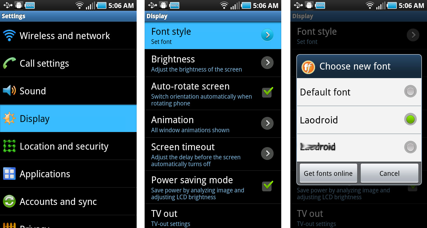 ເຂົ້າໄປທີ່ເມນູ Settings ໃນໂທລະສັບ, ຫລັງຈາກນັ້ນກໍ່ເຂົ້າໄປທີ່ Display ເລືອກຫາຄຳວ່າ Font Style ແລ້ວກໍ່ກົດເຂົ້າໄປທີ່ Font Style ແລະ ເມຶ່ອກົດເຂົ້າໄປແລ້ວ ເລືອກໄປທີ່ຟ່ອນ ທີ່ຊື່ວ່າ LaoDroid ແລ້ວກໍ່ກົດ Yes ເພຶ່ອຍືນຍັນການເລືອກໃຊ້ຟ່ອນ ແລ້ວ