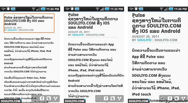 ພຽງເທົ່ານີ້ໂທລະສັບ ຫລື ແທັບເລັດ Galaxy Series ຂອງທ່ານກໍ່ຈະສາມາດອ່ານພາສາລາວໄດ້ແລ້ວ ພ້ອມທັງສາມາດຕິດຕາມຂ່າວສານຈາກເວັບ SOULIYO.COM ໄດ້ຜ່ານ App ທີ່ຊື່ Pulse ໄດ້ອີກດ້ວຍ (ລາຍລະອຽດຄິກທີ່ນີ້). ຫາກໃຊ້ແລ້ວໄດ້ຜົນດີ ຫລື ບໍ່ດີປະການໃດກໍ່ໄປຂຽນ Review ລົງ Market ໃຫ້ແດ່ເດີ່ ເພຶ່ອຄົນຕໍ່ໄປຈະໄດ້ມາເຫັນຄວາມເຫັນ ແລະ ຈະໄດ້ດາວໂຫລດໄປລອງໃຊ້ຕາມໆກັນ.