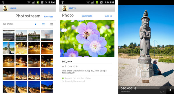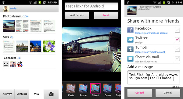 ໃນ Flickr ສຳລັບ Android ເວີຊັນທຳອິດນີ້ກໍ່ມີຫລາຍຄວາມສາມາດທີ່ຫນ້າສົນໃຈ ແລະ ເປັນຕາໃຊ້,​ ສ່ວນໂຕຜູ້ຂຽນແລ້ວ ມັກຄວາມສາມາດທີ່ເຮົາສາມາດໃສ່ Filter ເຂົ້າໄປໃນຮູບທີ່ຈະອັບໂຫລດຂຶ້ນໄປ Flickr ໄດ້, ນອກນັ້ນຍັງສາມາດເລືອກຮູບໄດ້ຈາກການຖ່າຍໃຫມ່ ຫລື ຈະເປັນຈາກອັລບັ້ມຮູບທີ່ມີຢູ່ກໍ່ໄດ້ ແຖມຍັງແຊໄປຍັງ Facebook, Twitter ແລະ Social network ອື່ນໄດ້ອີກດ້ວຍ.