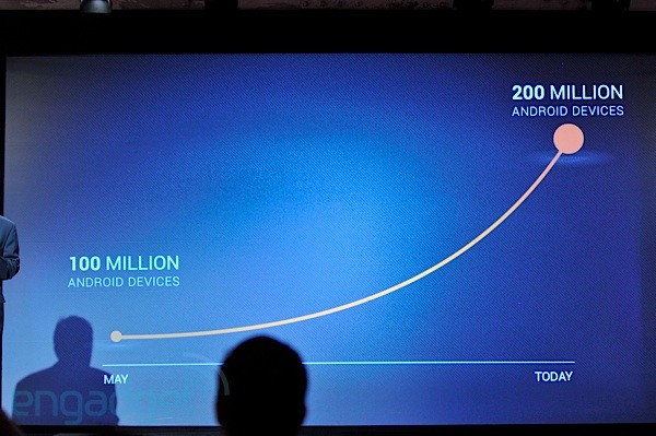 ໃນງານ These Go To Eleven ທາງ Google ໄດ້ປະກາດວ່າ ປະຈຸບັນມີອຸປະກອນ Android ທີ່ໄດ້ມີການເປີດໃຊ້ທັງຫມົດຫລາຍກວ່າ 200 ລ້ານອຸປະກອນແລ້ວທົ່ວໂລກ, ໂດຍສະເລ່ຍເປັນ 550,000 ອຸປະກອນຕໍ່ມື້ເທົ່ານັ້ນ. ໃນໂຕເລກດັ່ງກ່າວແມ່ນບອກໄດ້ວ່າ ຕອນນີ້ຕະຫລາດຂອງ Android ຂະຫຍາຍໂຕໄວພໍສົມຄວນ. ແລະເມຶ່ອເຫັນໂຕເລກນີ້ແລ້ວ ຫາກໃຜກຳລັງທີ່ຈະຊື້ໂທລະສັບ ຫລື Smart Phone ກໍ່ເລັງໆ Android ໄວ້ກໍ່ຫນ້າຈະດີ. 🙂