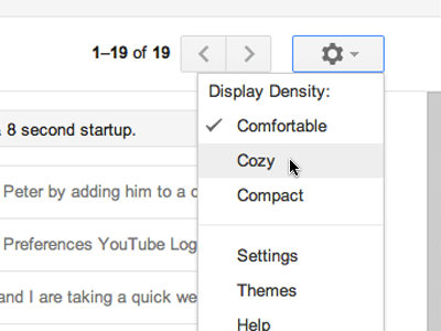 ຕໍ່ມາກໍ່ເປັນ Elastic density ເຊິ່ງຈະເປັນໂຕຈັດການຂະຫນາດຂອງການສະແດງຜົນ, ຄືໃນ Gmail ເວີຊັ່ນໃຫມ່ນີ້ຈະຮອງຮັບການສະແດງຜົນໃນຫນ້າຈໍທຸກຂະຫນາດ ບໍ່ວ່າຫນ້າຈໍຈະນ້ອຍຫລືໃຫຍ່ ຫລື ທ່ານຈະຂະຫຍາຍອອກ ຫລື ຫຍໍ້ເຂົ້າ ມັນກໍ່ຈະມີການປັບໂຕລົງໃຫ້ສົມດຸນ ກັບຂະຫນາດນັ້ນໆ ພ້ອມນັ້ນຍັງສາມາດປັບໄດ້ ງ່າຍໆດ້ວຍການຄິກທີ່ປຸ່ມ Setting.
