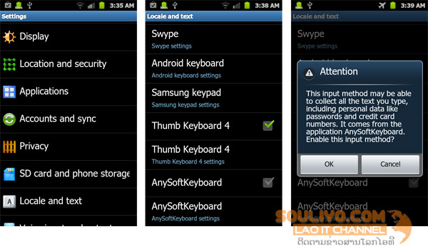 3. ເມຶ່ອຕິດຕັ້ງ Anysoftkeyboard ແລະ ແພັກພາສາລາວລົງໄປແລ້ວ, ຕໍ່ມາກໍ່ເປັນຂັ້ນຕອນຂອງການຕັ້ງຄ່າການເປີດໃຊ້ງານ, ເຊິ່ງທ່ານຜູ່ອ່ານສາມາດເຂົ້າໄປທີເມນູ Settings ແລ້ວກໍ່ເລືອນໄປກົດທີ່ Locale and Text ຫລັງຈາກນັ້ນໃຫ້ເລືອນໄປທີ່ AnySoftKeyboard ແລ້ວໃຫ້ເພີ່ມເອົາ AnySoftKeyboard ໂດຍການ check ເລືອກເອົາ, ເພຶ່ອເປີດໃຊ້ງານ ແລ້ວກໍ່ກົດ OK. (ຕົວຢ່າງສັງເກດໄດ້ຈາກຮູບລຸ່ມນີ້).