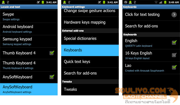 ເມຶ່ອຫລາຍຄົນມີການຮຽກຮ້ອງ ແລະ ຕ້ອງການຄວາມຊ່ວຍເຫລຶອກ່ຽວກັບການຕິດຕັ້ງແປ້ນພິມພາສາລາວໃນ Android, ທາງຜູ້ຂຽນເອງກໍ່ບໍ່ນັ່ງຢູ່ຫລ້າໆ, ແລະ ເມຶ່ອມີໂອກາດກໍ່ໄດ້ມາຂຽນບົດຄວາມແນະນຳວິທີການຕິດຕັ້ງແປ້ນພິມພາສາລາວ ໃນອຸປະກອນ Android ຂອງທ່ານ ດ້ວຍຂັ້ນຕອນງ່າຍໆຈຳນວນ 4ຂັ້ນຕອນ. ແຕ່ກ່ອນອື່ນ ຕ້ອງຂໍບອກກ່ອນວ່າ, Android ຂອງທ່ານຈະຕ້ອງຮອງຮັບການສະແດງຜົນພາສາລາວ. ເຊິ່ງຫາກທ່ານກຳລັງໃຊ້ງານອຸປະກອນຕະກຸນ Galaxy ຢູ່, ຖ່ານສາມາດເຂົ້າໄປຕິດຕາມວິທີການຕິດຕັ້ງຟ້ອນພາສາລາວໃນອຸປະກອນຂອງທ່ານກ່ອນ ທີ່ http://www.souliyo.com/galaxy-laodroid ແຕ່ຫາກວ່າໂທລະສັບຂອງທ່ານເປັນລຸ້ນອື່ນ, ກໍ່ໃຫ້ທ່ານຫາວິທີການ Root ແລ້ວນຳຟ້ອນພາສາລາວໄປແທນໃສ່ໄດ້. ແລ້ວຫລັງຈາກນັ້ນ ມາຕິດຕາມວິທີການຕິດຕັ້ງແປ້ນພິມພາສາລາວກັນ.