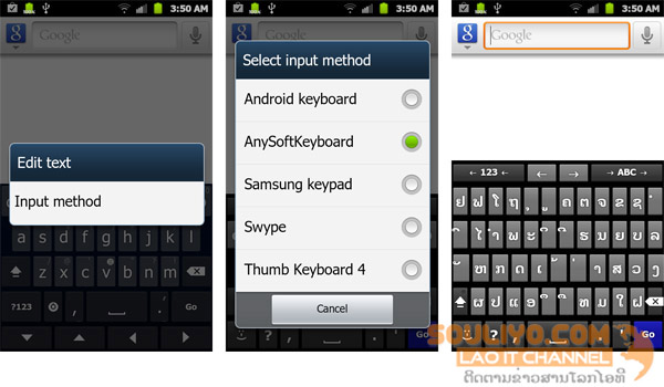 ພຽງເທົ່ານີ້ກໍ່ຖືວ່າສິ້ນສຸດການຕິດຕັ້ງ ຟ້ອນພາສາລາວ ແລະແປ້ນພິມພາສາລາວແລ້ວ, ໃນເວລາໃຊ້ງານ ແລະ ຢາກໃຊ້ງານພາສາລາວ ກໍ່ພຽງແຕ່ໃຫ້ທ່ານກົດຄ້າງໄປທີ່ຟອມ ຫລື ຊ່ອງຕື່ມຂໍ້ມູນ ຈົນຂຶ້ນເມນູມາໃຫ້ເລືອກ ກໍ່ໃຫ້ທ່ານເລືອກໄປທີ່ Input method ແລ້ວກໍ່ຈະມີລາຍຊື່ຄີບອດອອກມາໃຫ້ເລືອກ, ກໍ່ໃຫ້ທ່ານເລືອກ AnysoftKeyboard ແລະພຽງເທົ່ານີ້ກໍ່ພິມພາສາລາວໄດ້ແລ້ວ.