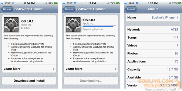 ສຳລັບຜູ້ໃຊ້ iPhone 3GS, iPhone 4, 4S, iPad 1/2 ຫລື iPod touch (3rd G, 4th G)  ທີ່ໃຊ້ງານ​ iOS 5 ຢູ່ ແລະ ຕ້ອງການອັບເດດ, ກໍ່ໃຫ້ເຂົ້າໄປທີ່ Setting > Genteral > Software Update ເພຶ່ອອັບເດດໄດ້ເລີຍ ຂະຫນາດ 44MB ໂດຍບໍ່ຕ້ອງເຊື່ອມຕໍ່ເຂົ້າກັບ iTunes ເລີຍ. ເພາະຢ່າລືມວ່າ iOS 5 ຮອງຮັບການອັບເດດແບບ OTA ຫລື Over The Air.