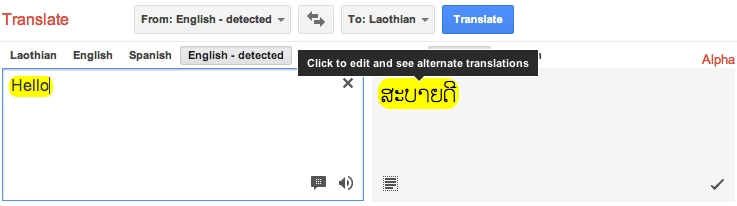 ຢ່າງໃດກໍ່ຕາມ, ສຳລັບພາສາລາວໃນ Google Translate ນັ້ນຍັງບໍ່ຄ່ອຍສົມບູນດີ ເມື່ອທຽບກັບພາສາອື່ນໆ. ສະນັ້ນແລ້ວ Google ຈຶ່ງຍັງໃຫ້ພາສາລາວຢູ່ໃນສະຖານະ Alpha ຢູ່. ຕໍ່ໄປນີ້ກໍ່ເປັນຂັ້ນຕອນໃນການເກັບຂໍ້ມູນເພື່ອປັບປຸງລະບົບໃຫ້ດີຂຶ້ນ ແລະ ຂ່າວດີຄືທຸກໆທ່ານສາມາດຊ່ວຍໃນການປັບປຸງລະບົບແປພາສານີ້ໄດ້ງ່າຍໆ ດ້ວຍການເຂົ້າໄປແປພາສາໃນ Google ແລະ ເວລາທີ່ທ່ານເຫັນຄຳທີ່ບໍ່ກົງກັນ ຫຼື ຄຳທີ່ບໍ່ຖືກຕ້ອງ ໃຫ້ທ່ານຄິກທີ່ຄຳເຫຼົ່ານັ້ນ ແລ້ວເລືອກຄຳແປໂຕອື່ນທີ່ເໝາະສົມກວ່າ ແລະ ມີຄວາມຊັດເຈນ ແລະ ຖືກຕ້ອງກວ່າ. ນອກນັ້ນແລ້ວ ໃນບາງຄຳອາດຈະມີການແປອອກມາຜິດລຳດັບ ທ່ານຍັງສາມາດຊ່ວຍໃນການປັບປຸງໄດ້ ດ້ວຍການລາກ ແລະ ຍ້າຍຕຳແໜ່ງຂອງຄຳ.
