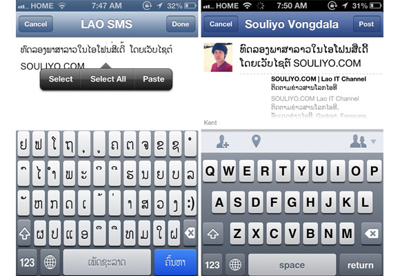 ກ່ອນໜ້ານີ້ທາງເວັບໄດ້ແນະນຳວິທີການເພື່ອເຮັດໃຫ້ iPhone ແລະ iPod touch ຂອງທ່ານສາມາດພິມພາສາລາວໄດ້. ເຊິ່ງກໍ່ມີຫຼາຍຄົນສົ່ງອີເມວເຂົ້າມາຖາມວ່າ ແລ້ວມີວິທີອື່ນບໍ່ທີ່ຈະເຮັດໃຫ້ມັນພິມໄດ້ງ່າຍ ແລະ ສະດວກຂຶ້ນ. ມາມື້ນີ້ຜູ່ຂຽນເອງກໍ່ໄດ້ຄຳຕອບນັ້ນແລ້ວ ແລະ ເຊື່ອວ່າຫຼາຍທ່ານຈະບໍ່ຜິດຫວັງຢ່າງແນ່ນອນ ເພາະມັນຄືແປ້ນພິມພາສາລາວແບບມາດຕະຖານທົ່ວໄປ.
