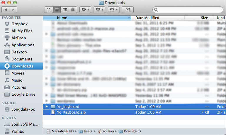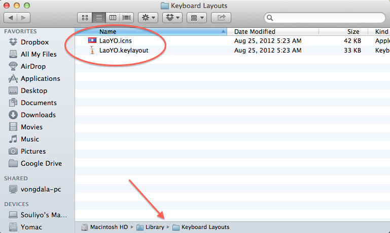 ຫລັງຈາກແຕກໄຟລ໌ອອກມາແລ້ວ ກໍ່ໃຫ້ທ່ານເຂົ້າໄປທີ່ໂຟນເດີ່ Yo_Keyboard ແລ້ວກໍ່ Copy ເອົາໄຟລ໌ທັງໝົດທີ່ຢູ່ທາງດ້ານໃນ. ຫຼັງຈາກນັ້ນໃຫ້ໄປທີ່ Drive ຫຼັກທີ່ເກັບລະບົບປະຕິບັດການໄວ້ ແລ້ວເຂົ້າໄປທີ່ Library > Keyboard Layouts. ຕົວຢ່າງ: Drive ຫຼັກຂອງ Mac ຂອງຂ້າພະເຈົ້າຊື່ວ່າ Macintosh HD ໂຟນເດີ່ດັ່ງກ່າວຈະຢູ່ທີ່ Macintosh HD > Library > Keyboard Layouts ແລະເມື່ອເຂົ້າມາຮອດແລ້ວ ກໍ່ໃຫ້ທ່ານ Paste ໄຟລ໌ທີ່ Copy ມາ ລົງໄປທີ່ໂຟນເດີ່ດັ່ງກ່າວ.