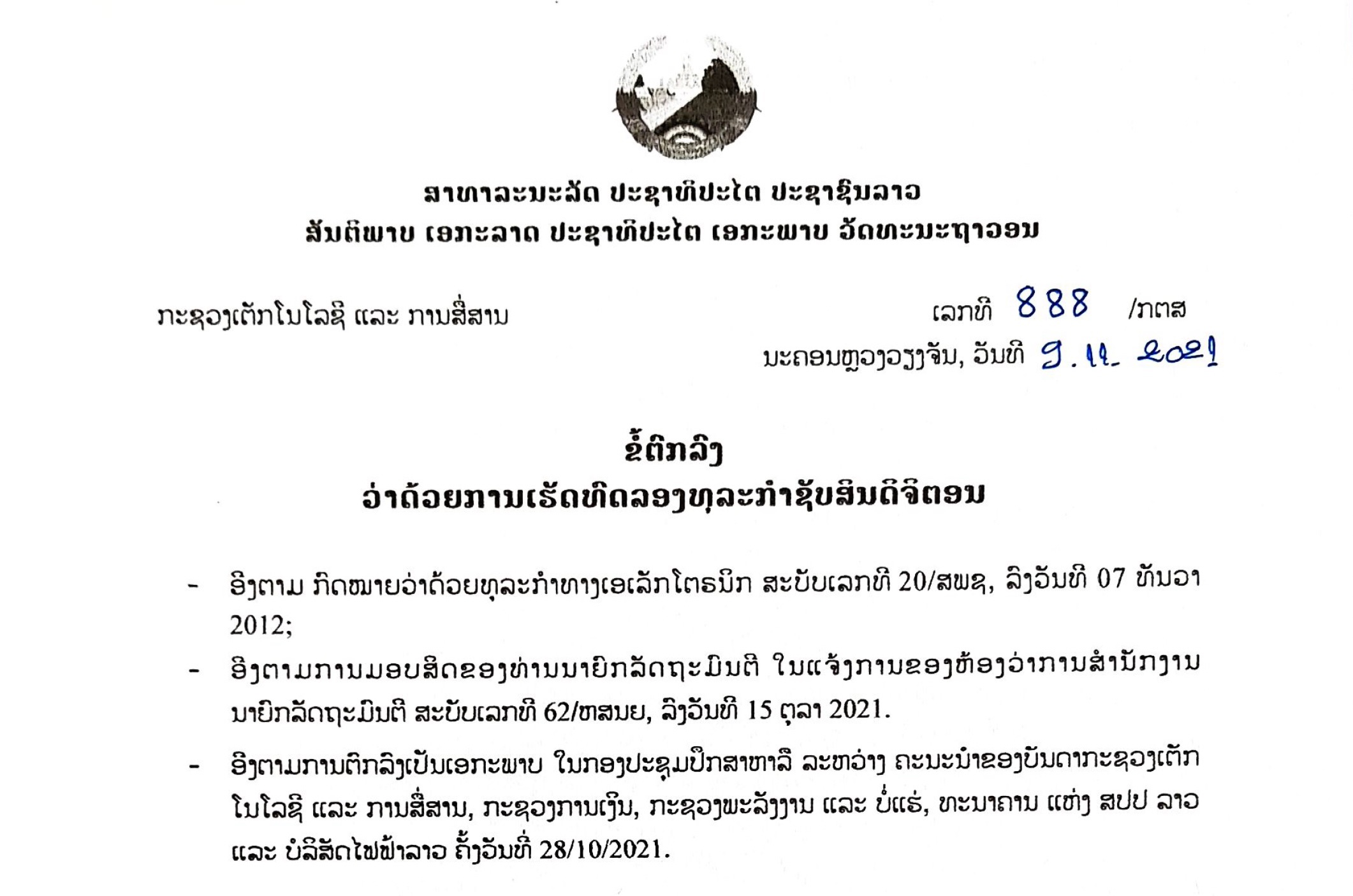 ຂໍ້ມູນອີງຈາກ ຂໍ້ຕົກລົງ ວ່າດ້ວຍການເຮັດທົດລອງທຸລະກໍາຊັບສິນດິຈິຕອນ 888/ກຕສ ກະຊວງເຕັກໂນໂລຊີ ແລະ ການສື່ສານ